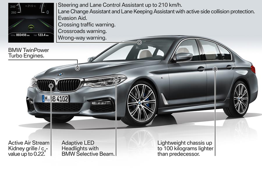 אוטוניוז, 15.10.2016 – ב.מ.וו חשפה את הדור השישי של סידרה 5 כשהיא מצוידת בשני מנועי בנזין חדשים, גירסת פלאג-אין הייבריד ואמצעי נהיגה חצי אוטונומית המתחרים ישירות באלה של מרצדס-בנץ E Class שהוצגה בשנה האחרונה. הדגם שגדל מעט במידותיו בכל המימדים ובסיס הגלגלים שלו התארך במעט, שוקל 100 ק”ג פחות מהדגם היוצא הודות לשימוש נרחב יותר בפלדה קלה ובאלומיניום (מכסה תא המטען מיוצר מאלומיניום). אולם ב.מ.וו לא ניצלה עדיין את הידע והניסון שצברה בשימוש בחומרים מרוכבים, מהם מיוצרים הדגמים מסידרה i, בדגם החדש, בדגם החדש.